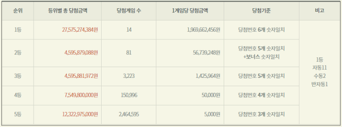 ■ 1등 : 1056회 로또 당첨번호 중 6개를 맞힌, 1등인 분들은 총 14명이며 이들은 각각 19억 6966만 2456원의 당첨금을 수령하게 됩니다.